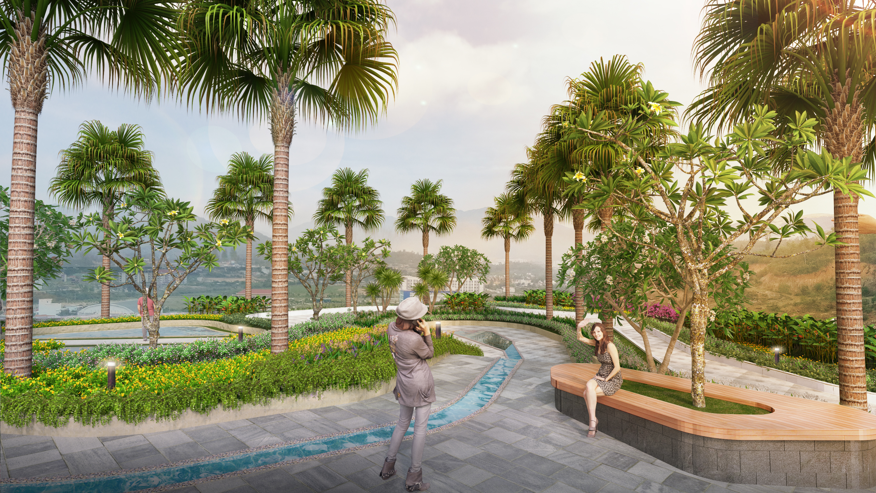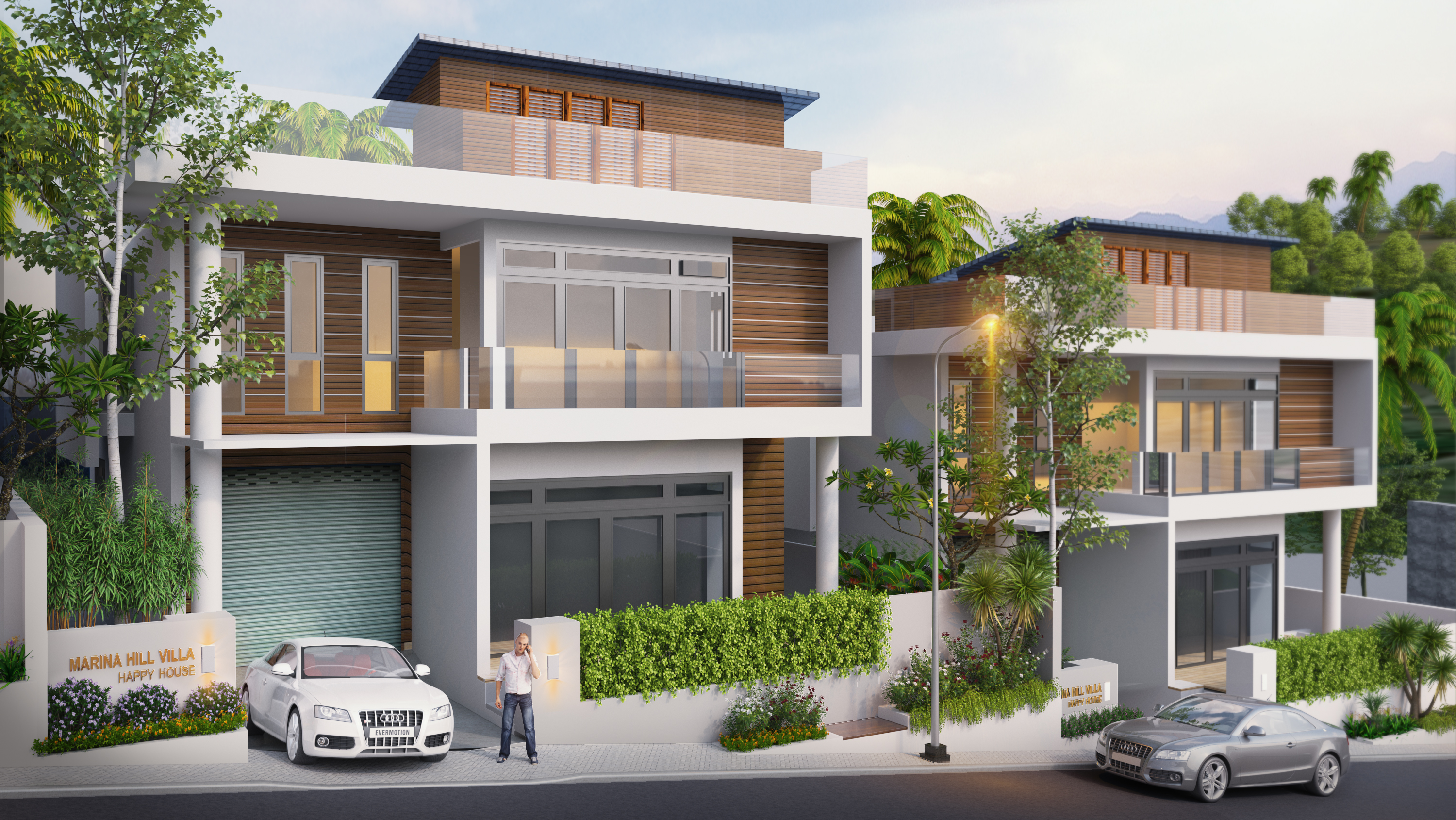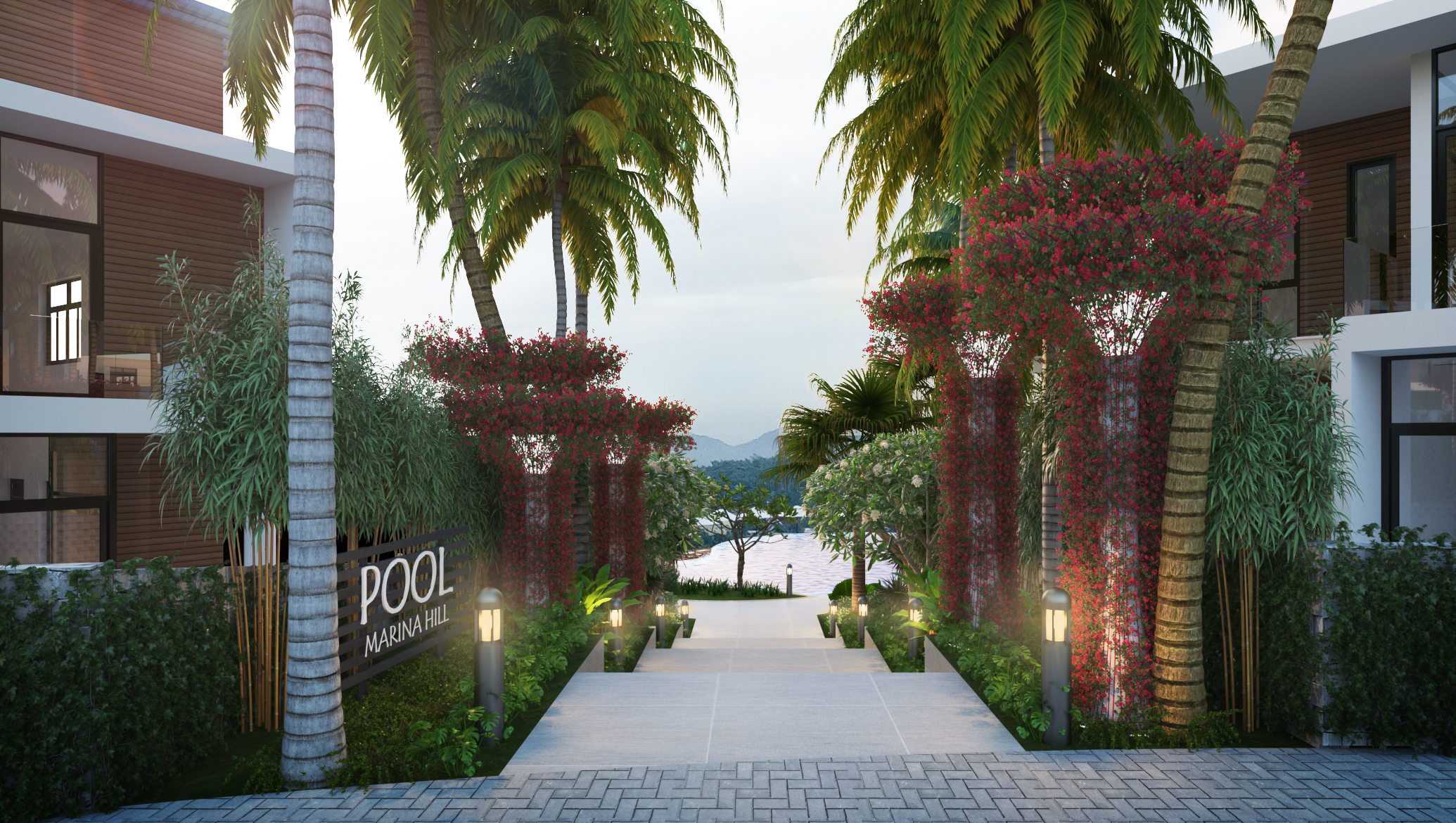 Cảnh quan khu biệt thự Marina Hill được thiết kế khai thác được đặc trưng địa hình đồi núi của khu vực vừa khai thác được tầm nhìn ra thành phố với các không gian đa dạng, thân thiện: cổng vào, vườn dạo, hồ bơi, bar, BBQ, taluy, cà phê ngoài trời… tạo nên sức sống và linh hồn cho khu biệt thự. Thiết kế ưu tiên sử dụng vật liệu và cây trồng địa phương, phù hợp với khí hậu và môi trường bản địa như cây Gió Bầu, Phát Tài Núi… để tạo ra bản sắc riêng cho dự án.