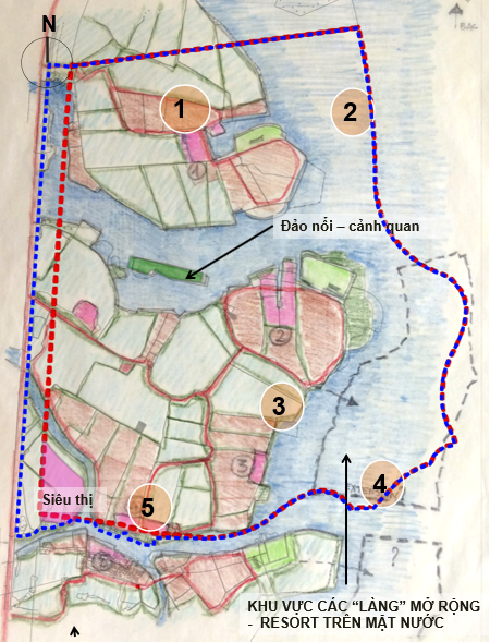 Dựa trên nghiên cứu đặc điểm cảnh quan đầm lầy, ao hồ, rừng ngập mặn và hình thái cư trú bản địa, dự án được tổ chức thành 5 “làng sinh thái” đặc trưng: