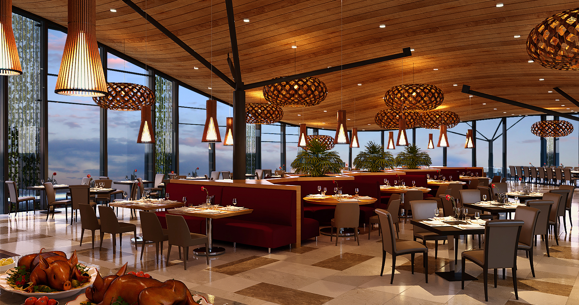 The interior design of the café -fast food and restaurant with modern décor, using the color combination of neutral and bright, especially the ceiling design is curved impressively in the form of roof The column system is freed to create large space, airy but still bring a cozy feeling, close.
